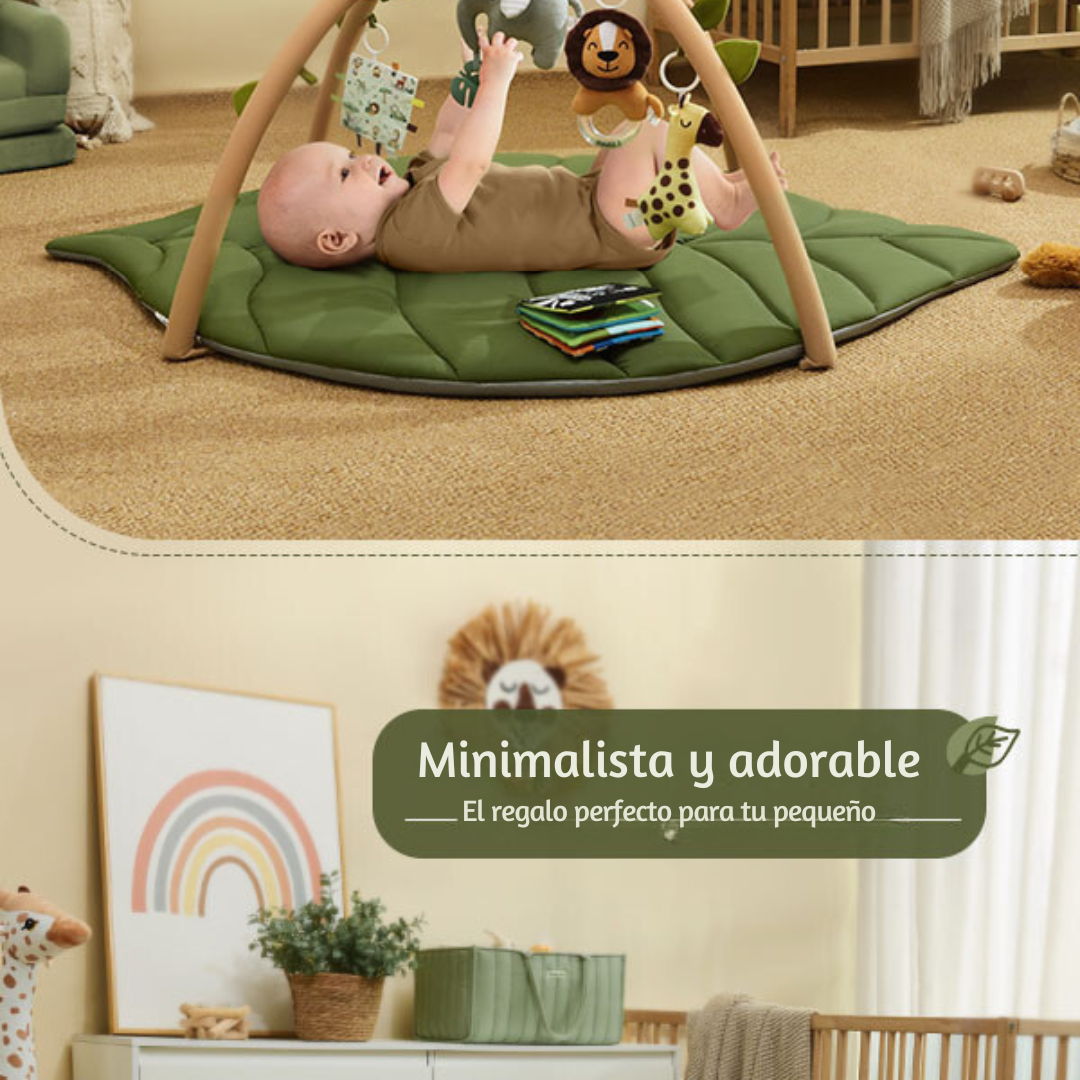 Nuestro Baby Gym está diseñado con la más alta calidad y pensando en las necesidades de tu bebé. Cada detalle ha sido cuidadosamente seleccionado para ofrecer una experiencia segura y estimulante. Los juguetes colgante promueven su curiosidad natural. Además, el gimnasio es fácil de montar y desmontar, lo que lo convierte en una opción práctica para padres.